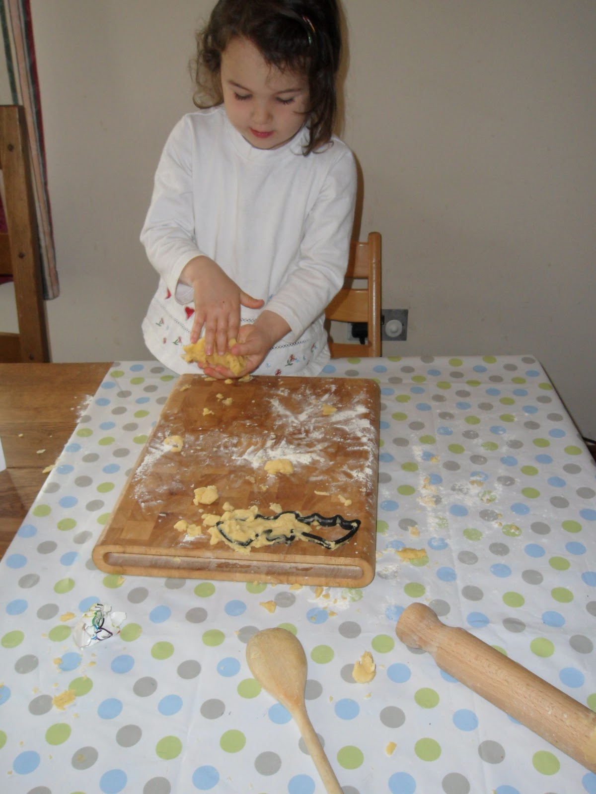 The supermarket had some boxes of halloween cake and biscuit on offer. After we had made the bat buiscuits I let the girls have some dough each to experiment with.Most of it ended up on the floor!